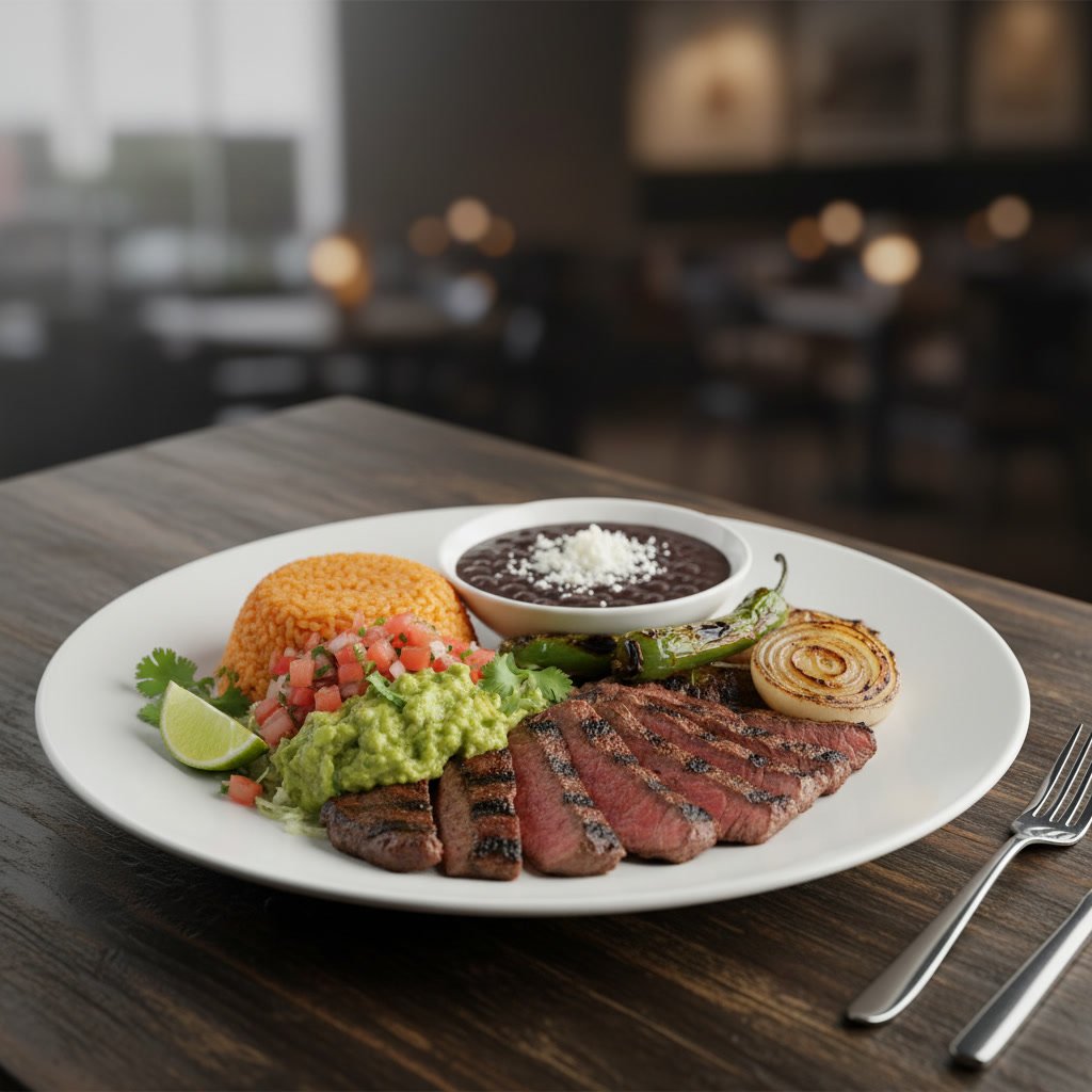 Carne asada a la parrilla con arroz, frijoles y ensalada fresca.