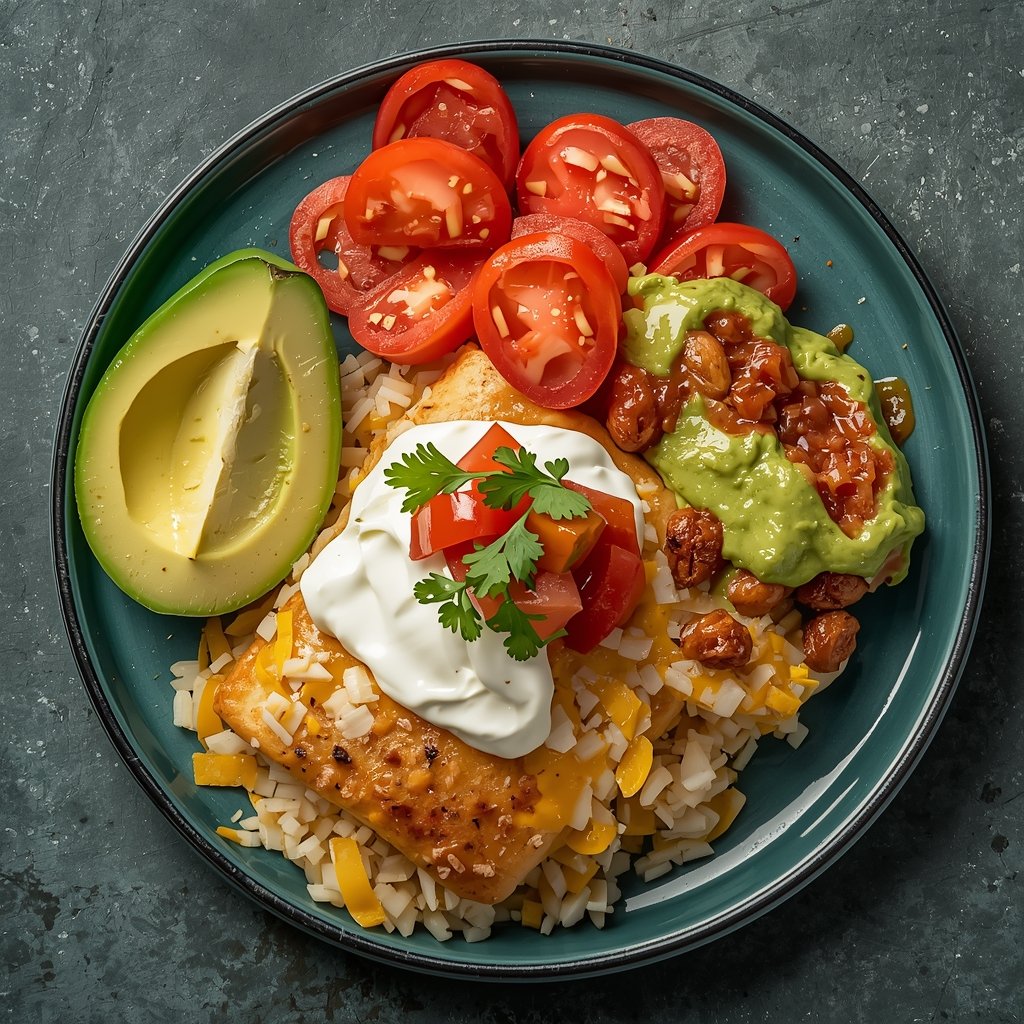 Arroz, frijoles, queso, lechuga, crema, salsa y pico de gallo.