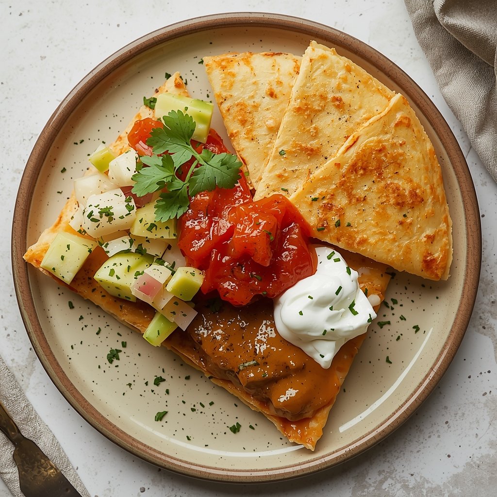 Tortilla de harina, queso mix, cebolla y chile dulce.