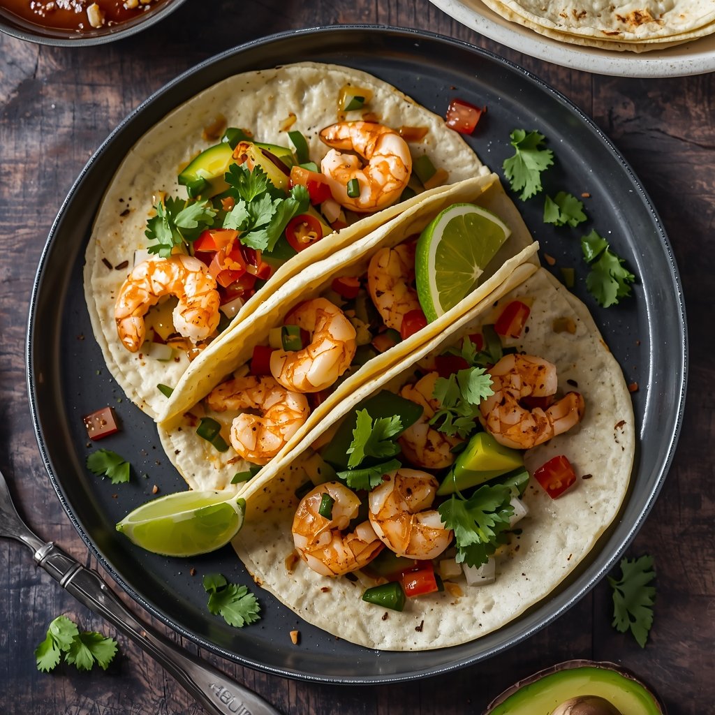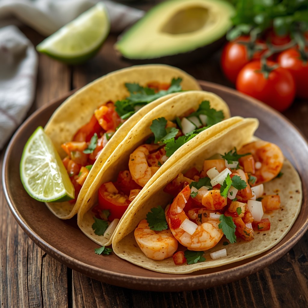 Camarón, cilantro, cebolla, tomate, limón y aguacate.